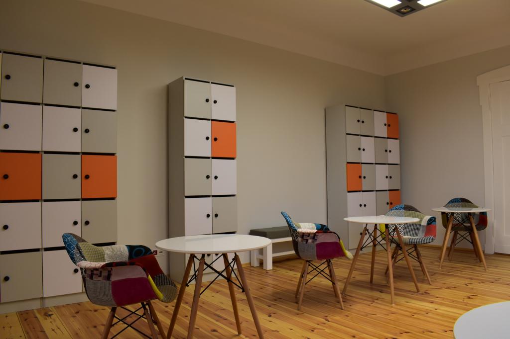 Pomieszczenie wyposażone jest w szafki szyfrowane zamkiem, krzesła, stoliki oraz ławkę. Jej wnętrze pozwala użytkownikom na spotkania biznesowe, a szafki umożliwią przechowywanie niezbędnych do pracy rzeczy i dokumentów.